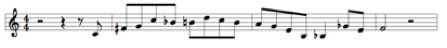 Bei 6:41 spielt Parker eine weitere starke Clave-artige Figur, gefolgt von einem [Cram; mit Tönen vollgestopfte Phrase]. Schließlich liebe ich die spontane Harmonisierung, die Bird im Thema am Ende macht, und zwar besonders die melodisch symmetrische Phrase bei 7:39, wobei der Des-Auftakt zur nächsten Phrase (mehr ein vermindertes D als ein reines D) die Symmetrie-Achse der vorangehenden 10 Tonhöhen ist: |