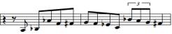 Both forms of this tetrachord are plentiful in Bird's spontaneous melodies and are among his favorite melodic structures. Even if you did not know the underlying harmonic structure of the song, you could discern the melodic structure by listening to how Bird emphasizes the second pitch from the top of the tetrachord, demonstrating which are the main tones and which are the passing tones. This again shows the importance of rhythm and stress in this music. Also in the consequent, Bird contracts the end of the phrase, again highlighting the structure of the tetrachord. Aurally this subtle change would probably be unnoticed by most listeners, which is the point, as in this case the consequent is really a subtle paraphrase of the antecedent. There is functional symmetry involved here, as technically the beginning of the two phrases contain the same pitches, but the B and Bb change function relative to the two tetrachords. In the first figure (1st measure), B natural is functionally part of the tetrachord and Bb is the passing tone, whereas in the second figure (middle of the 3rd measure) Bb is functionally part of the tetrachord and B natural is the passing tone. |